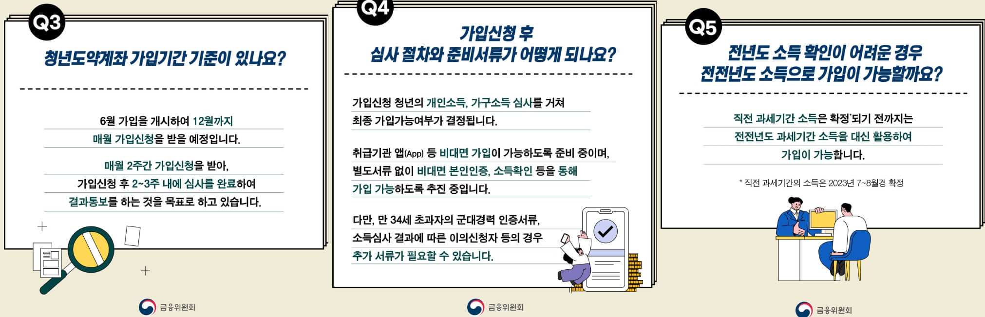 청년도약계좌는 올해 6월부터 가입을 개시해 12월까지 매달 신청을 받아 비대면 심사를 진행할 예정입니다. 매월 2주간 가입 신청을 받은 후 2-3주의 심사를 거쳐 결과 통보를 하는 것을 목표로 하고 있습니다.