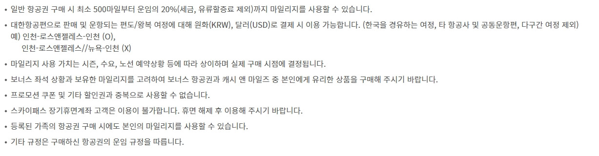본인의 마일리지를 차감하여 항공권을 구매할 수 있습니다. 대한항공 운항 노선에 한해서 가능하며 성인 및 좌석을 점유하는 유아, 소아도 동일하게 적용됩니다. 보너스 항공권 예매 시 공제 마일리지 외에 수수료 및 세금이 부과되며, 출발 날짜가 성수기에 해당된다면 더 많은 마일리지를 공제합니다. 보너스 항공권의 유효기간은 발권일로부터 1년으로,연장은 불가능하나 유효 기간 내에 환불, 일정 변경은 가능합니다.