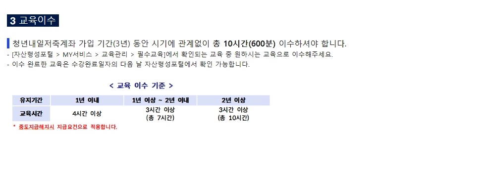 ※ 정부지원금을 전액 지원받기 위해선 가입 후 근로활동을 지속하면서(3년간) 매월 10 만 원 이상을 저축해야 합니다. 또 한 자산형성 포털(hope.welfareinfo.or.kr)에서 10시간 온라인 교육을 이수하고,만기 6개월 전에는 자금사용계획서를 제출하여하 합니다.
