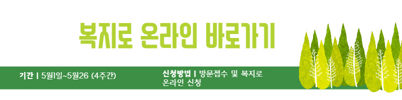 방문신청이 끝나는 5/15(월)~5/26(금) 까지 복지로 홈페이지에서 온라인 신청이 가능합니다.
