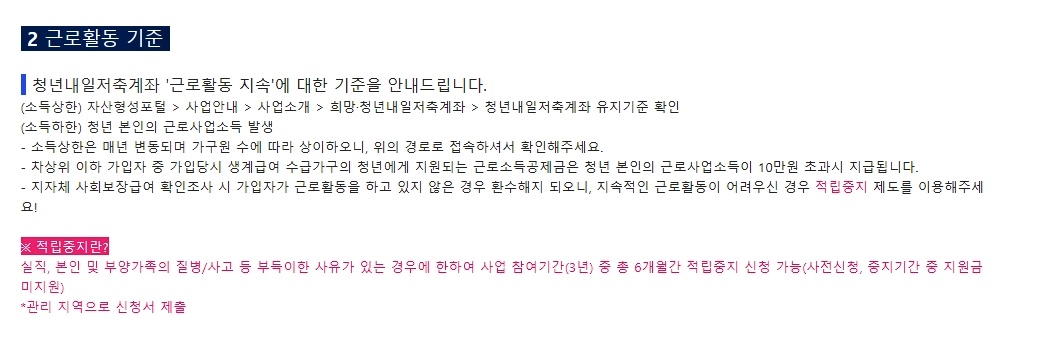 - 위와 같이 적립중지(2년)를 신청 시 계좌 가입기간은 5년으로 연장(1회 제한)되며, 정부 추가 지원금은 최대 3년 매칭·적립됩니다. 사전에 미신청한 상태로 근로활동 없음이 확인되는 경우 환수해지 되므로, 꼭 관련 증빙자료를 첨부하여적립중지를 신청하여야 합니다.