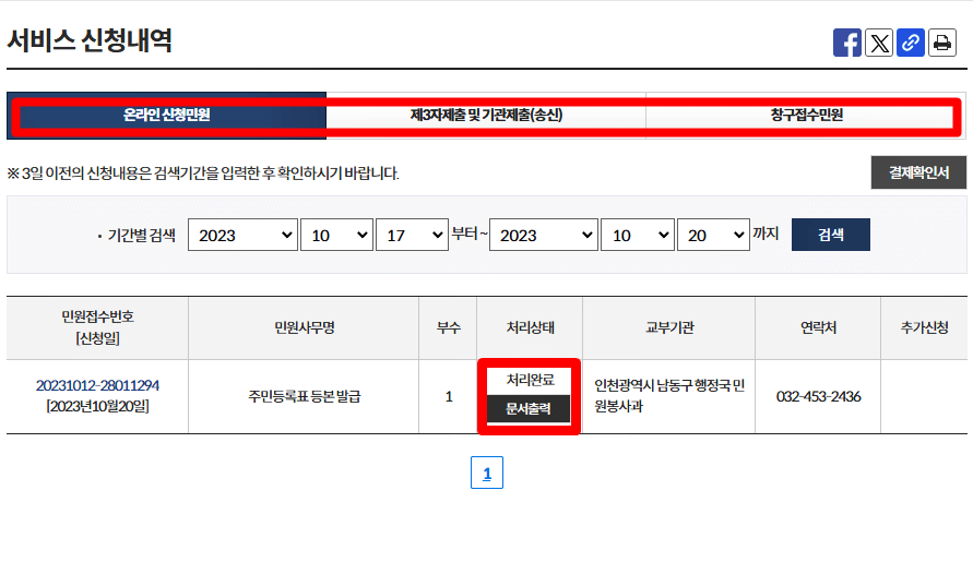 ⑤ 서비스 신청이 처리되고, 주민등록등본 인터넷 발급이 완료됩니다.