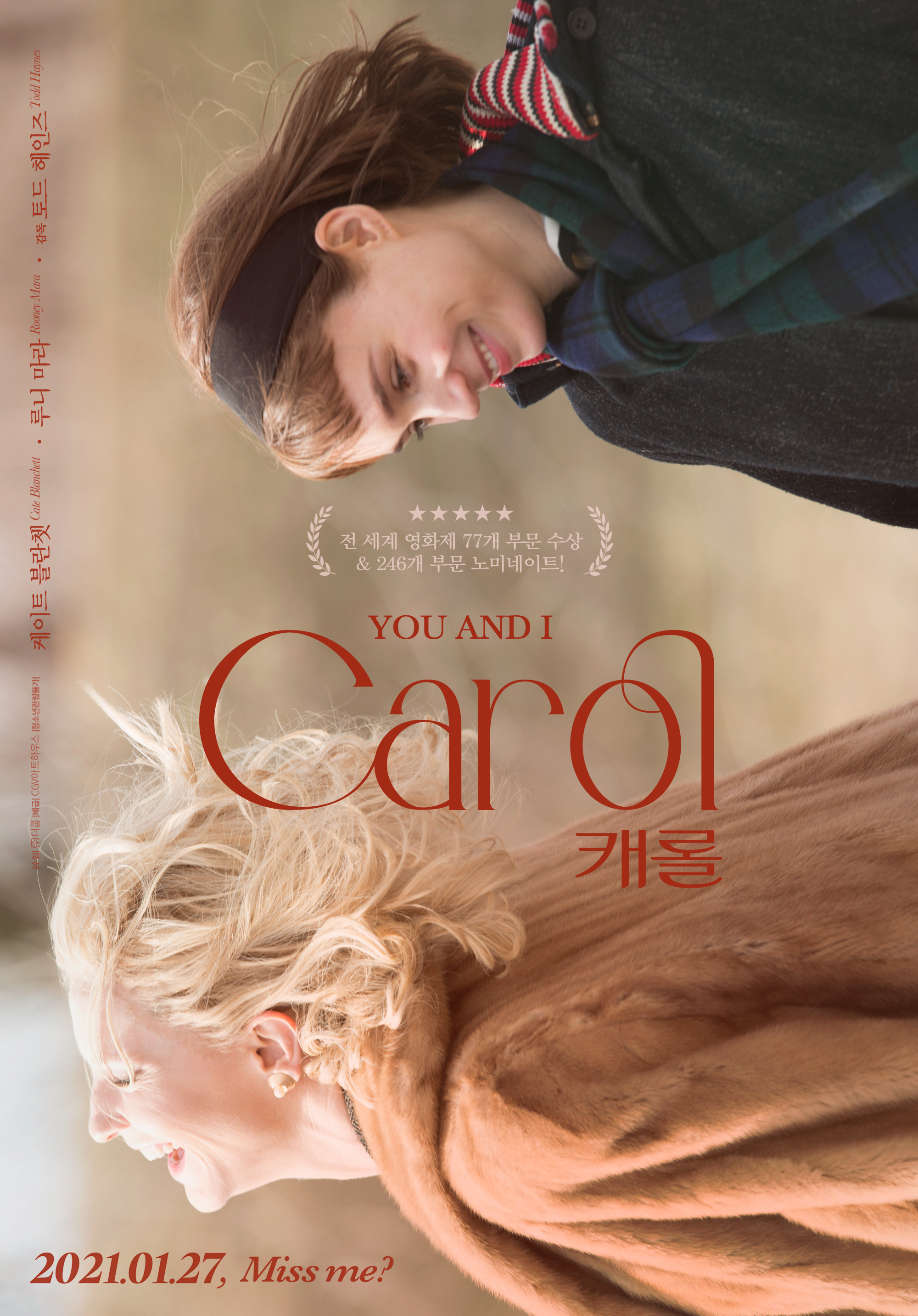 Carol은 같은 성의 사랑이라는 문제라기 보단 그냥 사랑 자체의 이야기이다. 한정된 영역으로 표현되기보단 포괄적이면서 일반적으로 접근했다. 주인공이 여성이라는 사실을 제외하면 다른 사랑이야기와 다를 바 없다. 감독과 배우는 그저 보편적인 "두 사람"의 사랑을 그려내고 있다. 케이트 블란쳇과 루니 마라 두 여배우의 눈빛만으로 '오직 그 사람만이 보이는 순간이 있다'란 말이 가장 잘 어울리는 영화가 되지 않았나 싶다.