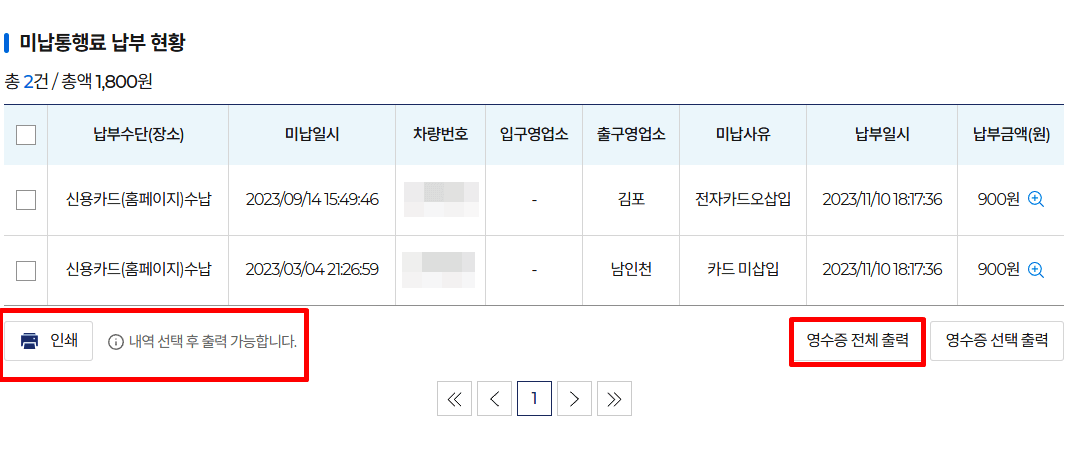 결제 완료 후 납부내역란에서 미납통행료 납부 현황을 확인할 수 있으며 내역 선택 후 영수증 출력도 가능합니다.