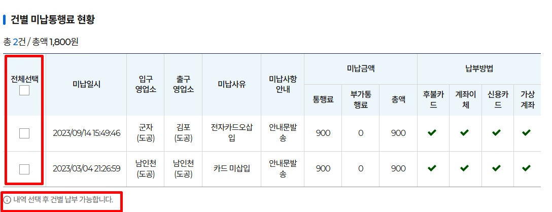 하이패스 미납요금 현황을 확인하고 내역 선택 후 건별 납부도 가능합니다.