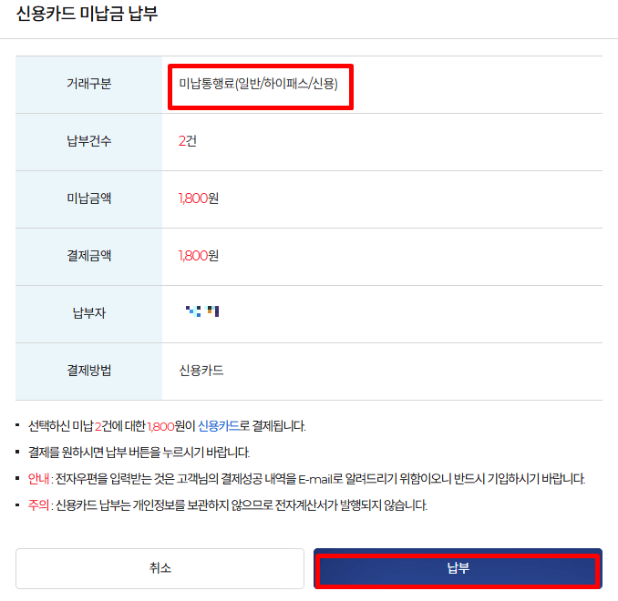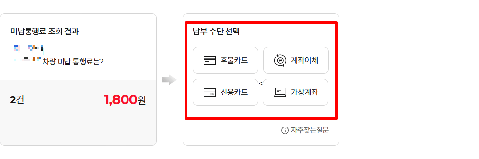 - 고속도로 미납통행료 납부가능 구간은 후불하이패스 카드, 신용카드, 계좌이체, 가상계좌별로 상이하며, "납부수단별 미납통행료 납부가능구간"을 참고하기 바랍니다.