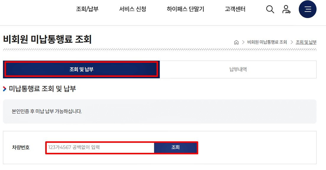 비회원 미납통행료 조회 및 납부에서 차량번호를 공백 없이 입력합니다.