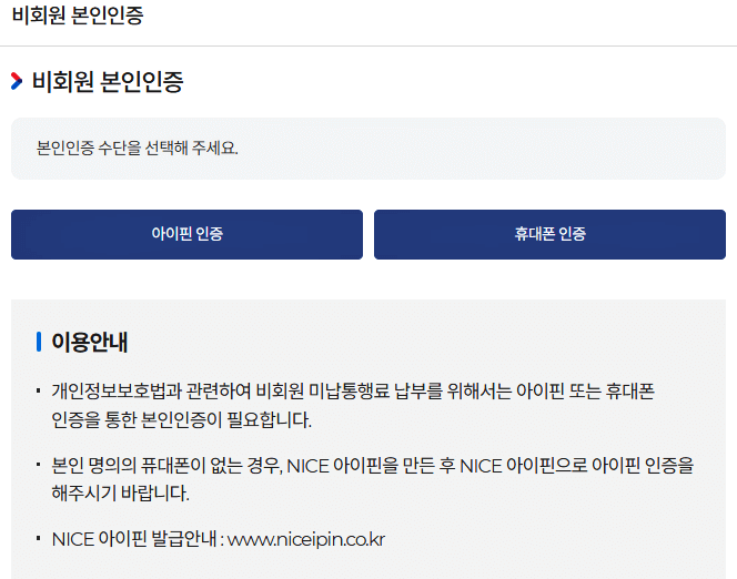 본인인증을 완료하면 조회 결과를 확인하고 후불카드, 신용카드, 계좌이체, 가상계좌 등 납부 수단을 선택합니다.