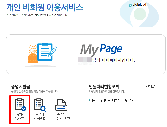 2. 메인화면에 증명서 발급 - 증면서 신청/발급을 클릭합니다