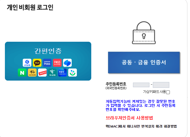3. 간편 인증 또는 공동·금융 인증서로 본인 인증을 합니다.