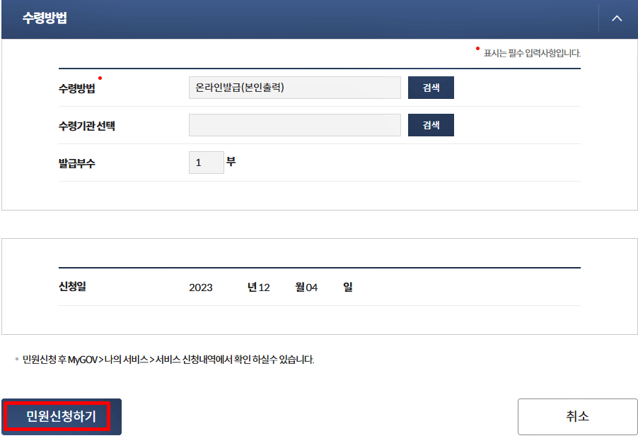 7. 수령방법과 부수를 체크하고 하단에 민원신청하기 버튼을 클릭합니다.