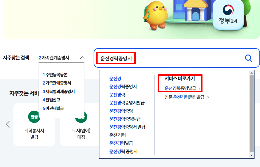 2. 검색창에 운전경력증명서를 입력하여 검색하여 발급 서비스로 이동합니다.