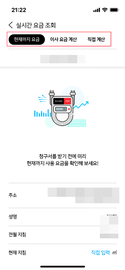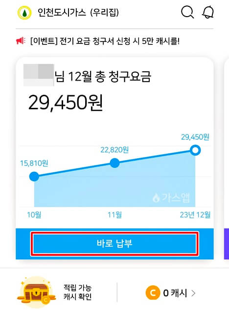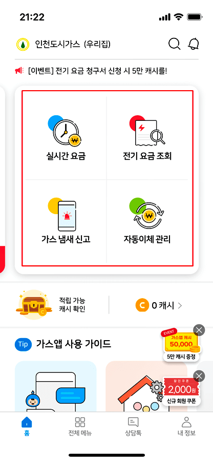 어플을 실행 후 본인인증을 거쳐 내 정보(우리집)가 등록되면 도시가스 실시간 요금을 확인할 수 있습니다.