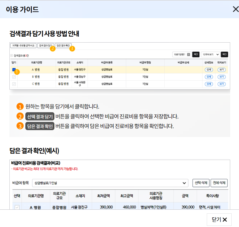 7. 각 기관을 선택하여 담아두고 담은 결과 확인으로 각 기관의 비용을 한눈에 비교해 볼 수 있습니다.