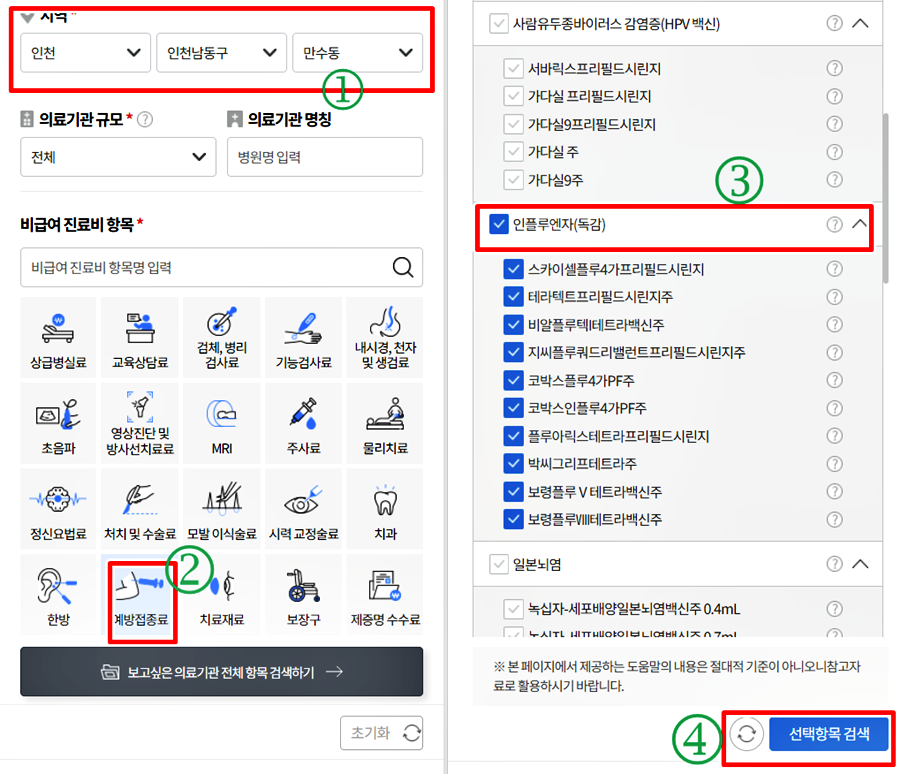 3. 좌측에 지역 선택 후 하단에 예방접종료를 클릭합니다. 우측에 나타나는 항목에서 인플루엔자(독감) 선택 후 하단에 검색을 클릭합니다.