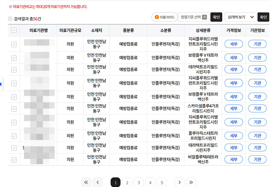 6.표에서 세부 버튼을 클릭하면 가격 정보를 알 수 있고, 기관을 버튼을 클릭하면 주소와 전화번호 등 기관정보를 확인할 수 있습니다.