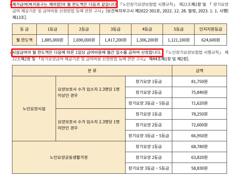 노인장기요양급여는 월 한도액 범위 안에서 급여되며, 재가급여와 시설급여로 나누어집니다. 재가급여와 시설급여 산정내용을 아래 사진으로 확인하시기 바랍니다.