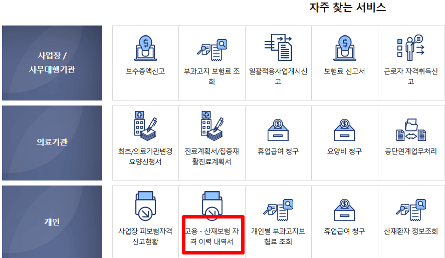 2. 개인메뉴 - [고용·산재보험 자격 이력 내역서] 메뉴를 클릭합니다.