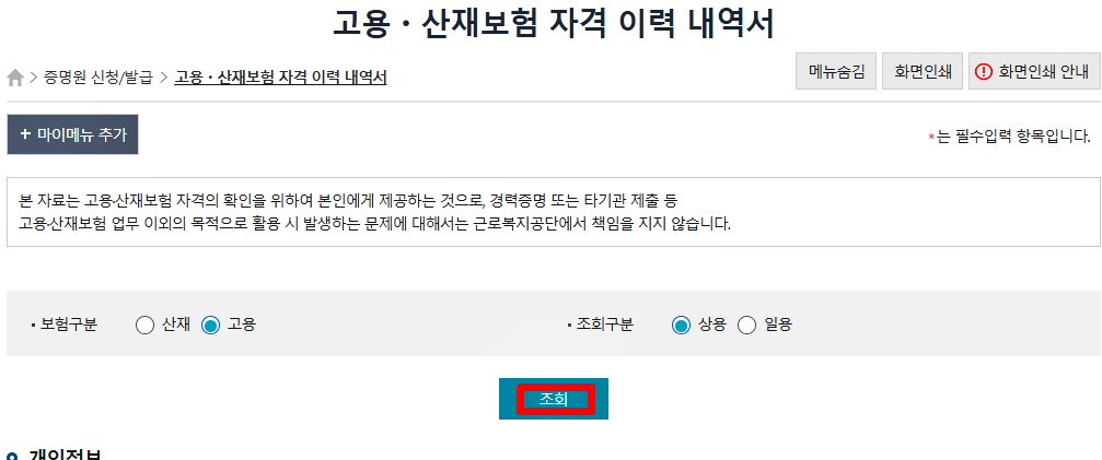3. 보험구분(산재,고용)과 조회구분(상용, 일용) 선택 후 조회 버튼을 클릭합니다.