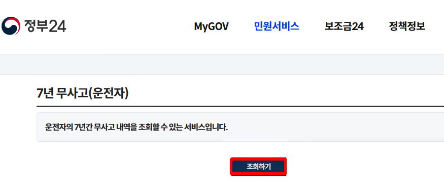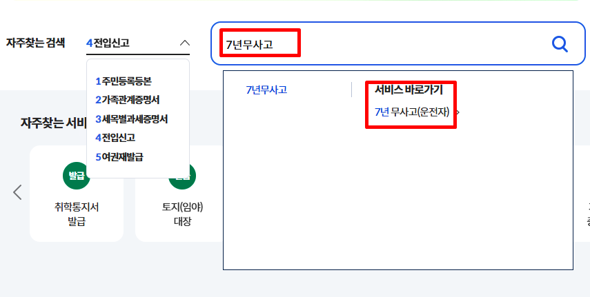 1.정부24 홈페이지에 접속하여 검색란에 [7년 무사고]로 검색 후 이동합니다.
