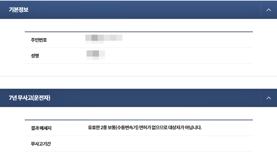 ※ 사고여부를 조회하는 서비스가 아니며 2종 보통(수동)을 소지하고 7년 이상 무사고인 경우